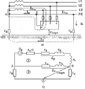 На рис. 3,б представлена эквивалентная схема электрической сети для случая замыкания фазы на корпус электроустановки. В контур 1 входят следующие схемные элементы.
