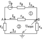 Для дальнейшего анализа воспользуемся упрощенной эквивалентной схемой без индуктивных элементов (рис. 6) Определим напряжение на корпусе электроустановки до момента срабатывания автоматической защиты.