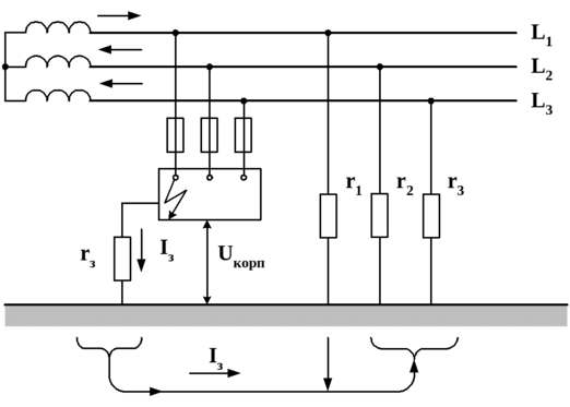 Таким образом, напряжение корпуса относительно земли зависит от соотношения сопротивлений r0 и rз. При равенстве r0 и rз напряжение на заземленном корпусе будет