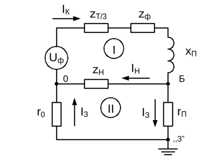 На рис.2 представлена эквивалентная схема зануления. На этой схеме: ZТ, Zф, Zн – полные сопротивления трансформатора, фазного и нулевого защитного проводников; ХП – внешнее индуктивное сопротивление петли фаза-нуль. С целью упрощения схемы сопротивлениями ZТ, Хф, Хн, ХП можно пренебречь. В дальнейшем при рассмотрении теоретической части и примеров расчета принимаем, что фазный и нулевой защитный проводники обладают лишь активными сопротивлениями Rф, Rн.