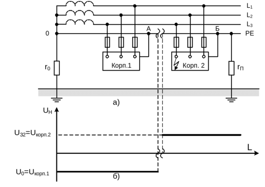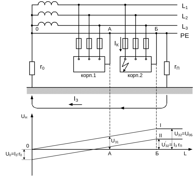 Если повторное заземление НЗП (т.е. РЕ-проводника) отсутствует, то при замыкании одного из фазных проводников на корпус второй электроустановки (рис.3) напряжение этого корпуса относительно земли Uз2, B, так же, как и всего участка нулевого защитного проводника за местом замыкания (вправо от точки Б), будет равно падению напряжения