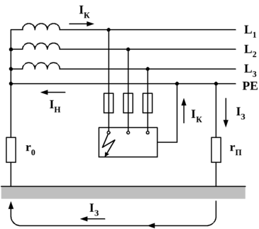 ринцип действия зануления – превращение замыкания на корпус в однофазное короткое замыкание (КЗ) (т.е. КЗ между фазным и нулевым защитным проводниками) с целью вызвать ток короткого замыкания Iк, способный обеспечить срабатывание максимальной токовой защиты и тем самым автоматически отключить поврежденную электроустановку от питающей сети.В качестве такой защиты используются плавкие предохранители или автоматические выключатели, устанавливаемые в цепи питания электроустановок.