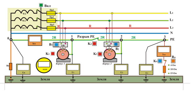 Для повторного заземления нулевого проводника используется кнопка К2. Сопротивление повторного заземления устанавливается кнопкой К4. Схема позволяет также моделировать обрыв нулевого проводника между двумя электроприемниками. Ток, стекающий в землю через повторный заземлитель, фиксируется амперметром.