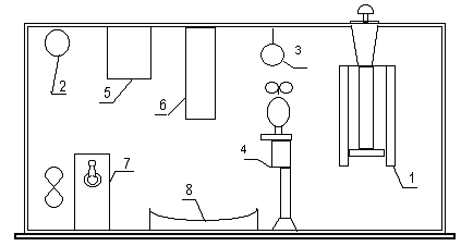 Внутри макета (рис. 1) для измерения основных параметром микроклимата установлены аспирационный психрометр (1), барометр (2), анемометр крыльчатый (3), анемометр чашечный (4), секундомер (5), гигрометр (6). Для создания воздушного потока на лабораторном стенде имеется вентилятор, включение которого производится тумблером (7). Для изменения влажности воздуха внутри макета имеется емкость с водой (8).В обычных условиях для измерения температуры воздуха используются термометры (ртутные или спиртовые), термографы (регистрирующие изменение температуры за определенное время) и сухие термометры психрометров. Для определения влажности воздуха применяются переносные аспирационные психрометры (Ассмана), реже стационарные психрометры (Августа) и гигрометры.