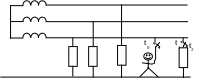 В момент времени t0 произошло однофазное прикосновение, через человека протекает ток Ih=Uф/(Rh+Z/3). В момент времени t1 происходит замыкание фазного провода, которого коснулся человек, при этом ток через человека снижается до значения отпускающего. В момент времени t2 происходит отключение фазы от земли, а в интервале времени t2 – t1 происходит освобождение человека.