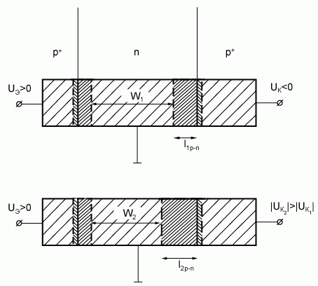 Рис. 5.11. Эффект Эрли - эффект модуляции ширины базы биполярного транзистора