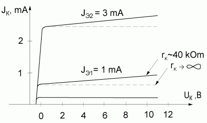 В активном режиме при Uк << 0 зависимость тока коллектора Iк от параметров биполярного транзистора выглядит следующим образом Iк = Iэ + Iк0. Из приведенного соотношения следует, что в явном виде ток коллектора Iк от напряжения на коллекторе Uк не зависит. Поэтому в первом приближении сопротивление коллекторного перехода rк при Uк << 0 стремиться к бесконечности.