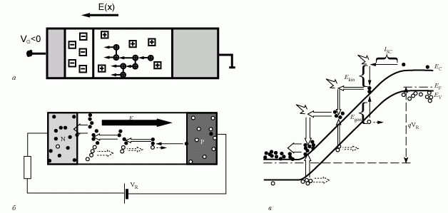 а) распределение электрического поля, доноров и акцепторов и свободных носителей; б) распределение токов; в) зонная диаграмма, иллюстрирующая лавинное умножение в ОПЗ