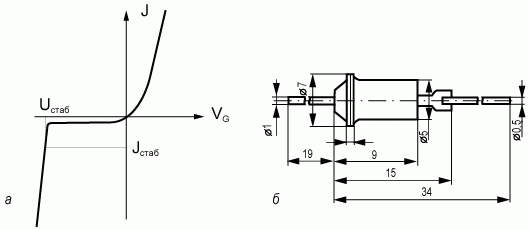 Рис. 4.9. Вольт-амперная характеристика (а) и конструкция корпуса (б) стабилитрона