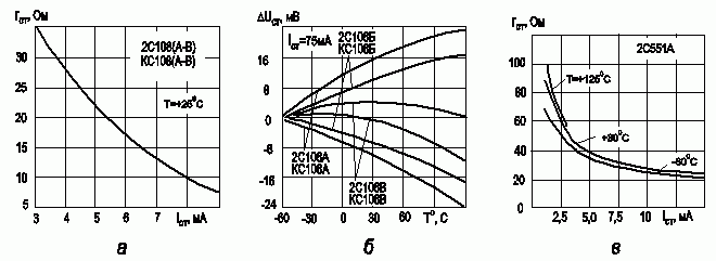 а) зависимость дифференциального сопротивления от прямого тока 2С108; б) зависимость изменения напряжения стабилизации от температуры для различных типономиналов стабилитрона 2С108; в) зависимость дифференциального сопротивления от прямого тока 2С351