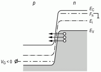 Рассмотрим зонную диаграмму диода с p-n переходом при обратном смещении при условии, что области эмиттера и базы диода легированы достаточно сильно (рис. 4.10).