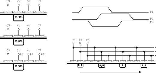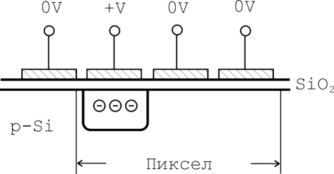 На рис. 1 показана структура одного элемента, линейного трехфазного ПЗС в режиме накопления. Структура состоит из слоя кремния р-типа (подложка), изолирующего слоя двуокиси кремния и набора пластин-электродов. Один из электродов смещен более положительно, чем остальные два, и именно под ним происходит накопление заряда. Полупроводник р-типа, получают добавлением (легирование) к кристаллу кремния акцепторных примесей, например, атомов бора. Акцепторная примесь создает в кристалле полупроводника свободные положительно заряженные носители — дырки. Дырки в полупроводнике р-типа являются основными носителями заряда: свободных электронов там очень мало. Если теперь подать небольшой положительный потенциал на один из электродов ячейки трехфазного ПЗС, а два других электрода оставить под нулевым потенциалом относительно подложки, то под положительно смещенным электродом образуется область обедненная основными носителями — дырками. Они будут оттеснены вглубь кристалла. На языке энергетических диаграмм это означает, что под электродом формируется потенциальная яма.