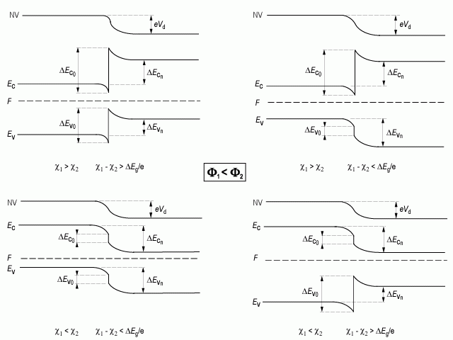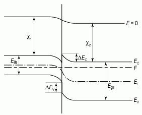 Для построения зонных диаграмм, детального анализа распределения электрического поля и потенциала в области пространственного заряда гетероперехода, а также величины и компонент электрического тока для гетеропереходов необходимо учитывать, что у различных полупроводников будут отличаться значения электронного сродства χ, ширины запрещенной зоны Еg и диэлектрической проницаемости εs.