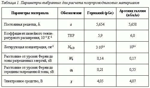С учетом этих факторов построим зонную диаграмму гетероперехода германий - арсенид галлия (pGe - nGaAs). Значения параметров полупроводниковых материалов, выбранных для расчета зонной диаграммы, приведены в таблице 1.