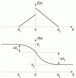 Функциональная зависимость электрического поля и потенциала в области пространственного заряда гетероперехода от координаты будет соответственно линейной и квадратичной, как и в случае p-n перехода. Скачок электрического поля в гетеропереходе на металлургической границе обусловлен различными значениями диэлектрических постоянных ε1 и ε2. В этом случае, согласно теореме Гаусса,
