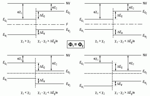 В зависимости от ширины запрещенной зоны Eg, электронного сродства χ и типа легирования узкозонной и широкозонной областей гетероперехода возможны различные комбинации Eg и χ. На рисунке 2.18 показаны эти комбинации при условии равенства термодинамических работ выхода.
