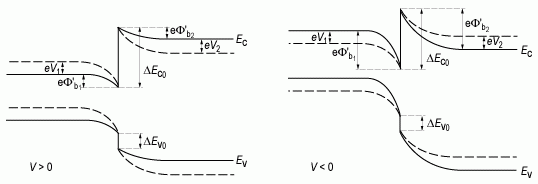 Рассмотрим зонную диаграмму гетероперехода при приложении внешнего напряжения V. Как и в случае p-n перехода, знак напряжения будет определяться знаком приложенного напряжения на p-область гетероперехода. На рисунке 2.23 приведены зонные диаграммы при положительном и отрицательном напряжениях на гетеропереходе nGe - pGaAs. Пунктиром на этих же зонных диаграммах изображены энергетические уровни в равновесных условиях V = 0.