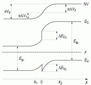 Высота потенциального барьера в гетеропереходе Δφ0 будет определяться суммой потенциалов для каждой из областей гетероперехода: