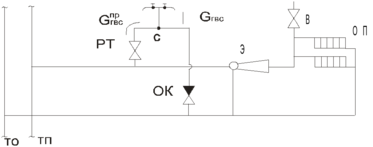 ОК - обратный клапан; Э - водоструйный эжектор или элеватор; РТ - регулятор температуры; В - воздушник; ОП - отопительный прибор; С - смеситель.