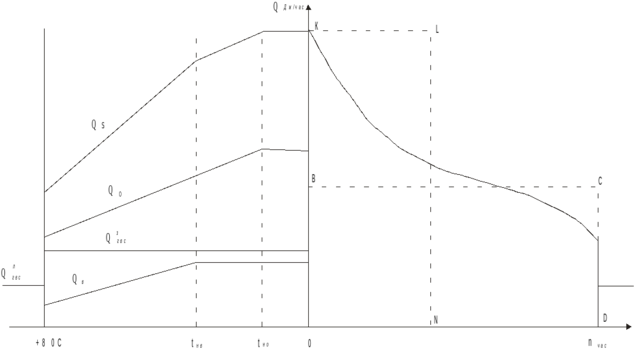На оси абсцисс откладывают количество часов, в течение которых наблюдается температура равная или меньшая данной. По оси ординат откладывают часовой расход тепла. Построим на графике два прямоугольника, площадь которых равна площади графика. Тогда для прямоугольника 0BCD0 высота CD равна среднему расходу тепла за отопительный период. Для прямоугольника 0KLN0 отрезок 0N представляет длительность использования расчетной тепловой нагрузки за сезон.