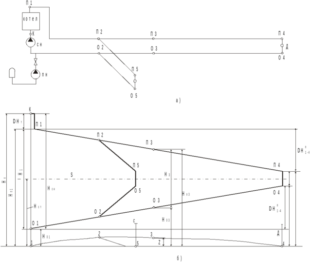 Рис.6.2. Схема (а) и пьезометрический график (б) двухтрубной тепловой сети