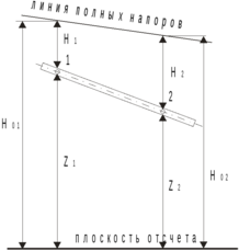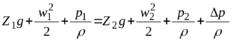 | Одномерное установившееся движение жидкости в трубе описывается уравнением Бернулли. Z1, Z2 – геометрическая высота оси трубы в сечениях 1 и 2; w1 и w2 – скорости движения жидкости в сечениях 1 и 2; p1 и p2 – давление жидкости на оси трубы в сечениях 1 и 2; Dp – падение давления на отрезке 1-2; g – ускорение свободного падения. Уравнение Бернулли можно записать относительно напоров, разделив обе части на g. |