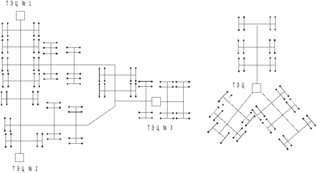 Рис.6.2. Кольцевая тепловая сеть от трех ТЭЦ Рис.6.3. Радиальная тепловая сеть