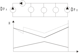 | При установке подкачивающих насосов на подающей или обратной линии положение точки водораздела смещается в направлении подкачивающего насоса (по подающей линии). Новое положение точки водораздела может быть определено так же, как и ранее, принимая напор на станции равным |