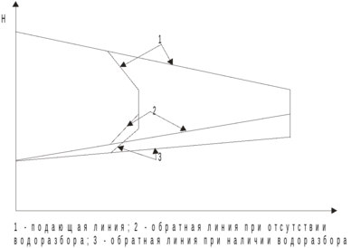 Пьезометрический график подающей линии остается постоянным при любом водоразборе из обратной линии, так как расход в подающей линии поддерживается постоянным с помощью регуляторов расхода на абонентских вводах. С увеличением водоразбора уменьшается расход в обратной линии и пьезометрический график обратной линии становится более пологим. Когда водоразбор равен расходу в подающей линии, расход в обратной равен нулю и пьезометрический график обратной линии становится горизонтальным. При одинаковых диаметрах прямой и обратной линий и отсутствии водоразбора графики напора в прямой и обратной линиях симметричны. При отсутствии водоразбора на ГВС расход воды равен расчетному расходу на отопление – Vo – в прямом и обратном трубопроводах. При водоразборе полностью из прямой линии расход воды в обратной линии равен расходу на отопление, а в подающей линии – сумме расходов на отопление и ГВС. При этом снижается располагаемый напор на системе отопления и расход воды Vo меньше расчетного. При водоразборе только из обратной линии располагаемый напор на систему отопления выше расчетного. Потери давления складываются из потерь давления в подающей линии, системе отопления и обратной линии.