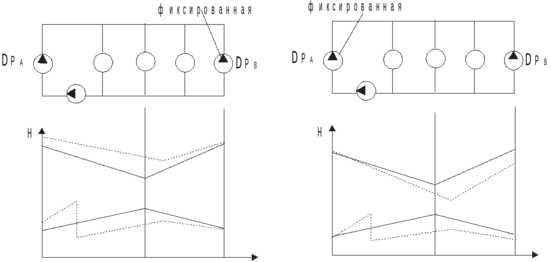 Для стабилизации режима давления при наличии подкачивающего насоса на одной из станций напор на входном коллекторе поддерживается постоянным. Эту станцию называют фиксированной, другие станции – свободными. При установке подкачивающего насоса напор во входном коллекторе свободной станции меняется на величину