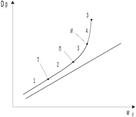 Происходит подвисание воды – т.П. Начинается третий режим – участок 3. Он характерен турбулизацией водяной пленки. При дальнейшем увеличении плотности орошения вся насадка залита водой, через которую барботируются продукты сгорания. Таким образом, вода становится сплошной средой, а газы – дисперсной. Это явление называется инверсией фаз – т.И. Участок 4 соответствует режиму эмульгирования газов. При дальнейшем увеличении плотности орошения происходит захлебывание – т.З. Вода вместе с газами выбрасывается из насадки и попадает в газоход.
