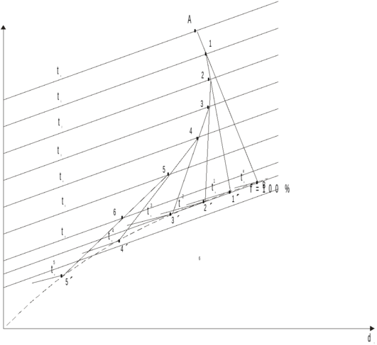 Сначала строится i-d диаграмма. Проводятся линии постоянной температуры. Линии постоянной энтальпии проводятся под углом 135 0 к оси ординат. Проводится линия f=100 %.
