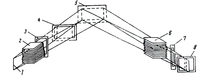 В аппарате «ДРОН-3» используется явление дифракции рентгеновских лучей, подчиняющихся закону Вульфа-Брэгга. Схема фокусировки представлена на рис. 1. Рентгеновское излучение от источника 1, находящегося на круге фокусировки, через систему щелей 3, 4, ограничивающих расходимость пучка в горизонтальном и вертикальном направлениях, падает на исследуемый образец 5, плоскость которого касается фокусирующей окружности. Дифрагированное излучение от исследуемого образца через систему щелей Соллера 6, аналитическую щель 7, находящуюся на фокусирующей окружности, и ограничивающую пучок в вертикальном направлении щель 8, попадает в детектор, в котором кванты рентгеновского излучения преобразуются в электрические импульсы.
