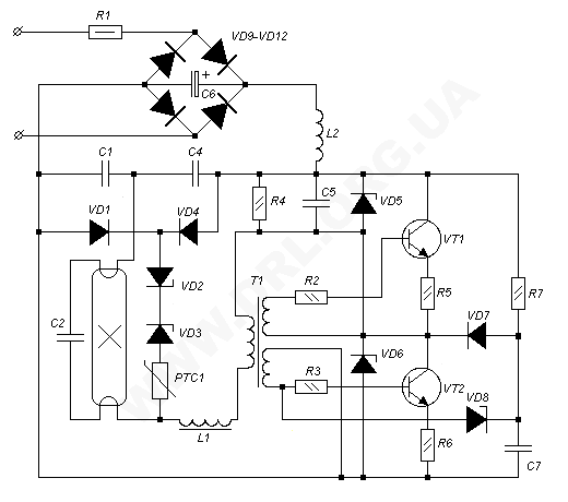 На транзисторах VT1 и VT2 собран высокочастотный автогенератор. Рабочая частота генератора около 30 кГц. Лампа подключается к нему через высокочастотный трансформатор T1 последовательно с балластным дросселем L1, который значительно меньше аналогичного дросселя для промышленной частоты.