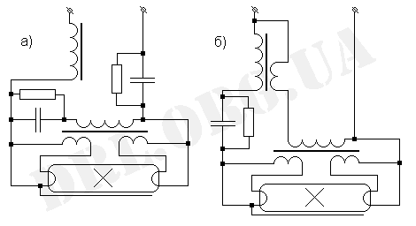 На схеме рис. 10,б применен резонансный контур, состоящий из одной половины дросселя и конденсатора, позволяющий получить высокое напряжение зажигания. В рабочем режиме лампы конденсатор обеспечивает повышение коэффициента мощности схемы. Недостаток схемы - возможность появления в процессе зажигания ламп однополупериодного режима работы.