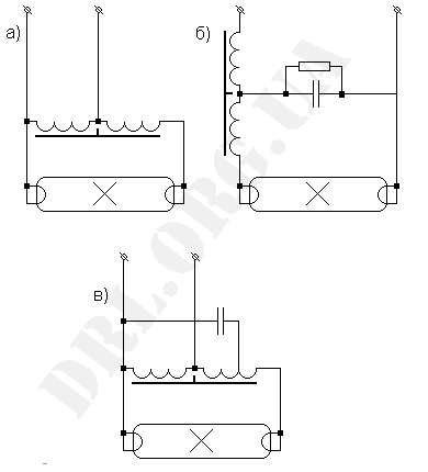 На рис. 10,а приведена схема с автотрансформатором с большим рассеянием, где необходимое высокое напряжение зажигания (400-600 В) получается благодаря соответствующему выбору коэффициента трансформации автотрансформатора. После зажигания лампы часть вторичной обмотки автотрансформатора оказывается включенной последовательно с лампой и выполняет роль балластного дросселя. Напряжение на лампе снижается и становится равным ее рабочему напряжению. Недостаток ПРА, выполненного по этой схеме, - большие размеры и значительные потери мощности.