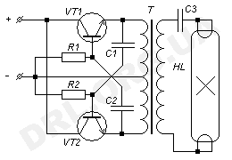а рис. 3 приведена схема, использующая симметричный мультивибратор. Ее достоинство по сравнению с остальными - питание лампы переменным током, а также высокий КПД. Транзисторы VT1, VT2 - любые подходящие по току и напряжению источника питания, резисторы R1 и R2, а также конденсаторы C1, C2 подбираются экспериментально (они должны быть одинаковых номиналов). Трансформатор можно применить такой же, как и в схеме на рис. 2. Конденсатор C3 играет роль балласта, его емкость подбирают исходя из частоты мультивибратора и мощности лампы. Мощность используемых ламп определяется мощностью трансформатора и транзисторов.