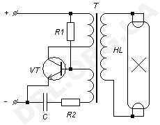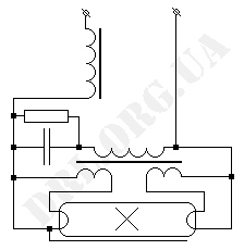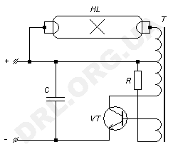 - в качестве балласта приходиться применять активное сопротивление в виде резистора или лампы накаливания. На балластном сопротивлении оказывается разность между рабочим напряжением лампы и напряжением сети, которая обычно составляет около 1,5-2. В результате на балласте рассеивается мощность, которая равна или выше мощности самой лампы, что обусловливает значительные потери в таких схемах.