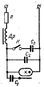ампа включается в сеть последовательно с дросселем (рис.1). Проводящая полоса на лампе подключена через небольшой разделительный конденсатор С1 емкостью 300-500 пФ. Параллельно лампе включен конденсатор С2 емкостью 2-3 мкФ. Последовательно с выключателем К включается конденсатор с емкостью 0,007-0,05 мкФ. При включении К образуется резонансный контур, состоящий из дросселя и конденсатора С3. На конденсаторе С3 создается повышенное напряжение, которое и зажигает в лампе разряд. Лампа разгорается в течении 10-15 мин. Также возможно зажигание лампы, если замкнуть подвод к одному из электродов на проводящую полосу, в следствии чего создастся электрическое поле которое возбудит разряд. Но этого поля в некоторых случаях может быть не достаточно.