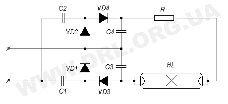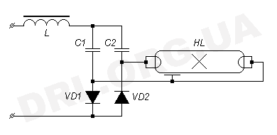 Здесь C1, C2, VD1, VD2 представляют собой выпрямитель с умножением напряжения. Конденсаторы C1 и C2 на 400 В, 0,5 мкФ. Диоды - КД105Б либо другие, с обратным напряжением не менее 300 В и прямым током не менее 0,5 А. Напряжение на электродах лампы в этой схеме составляет порядка 600 В, что может оказаться недостаточным для уверенного зажигания лампы, поэтому рекомендуется снабдить лампу пусковым электродом в виде полоски из фольги, приклеенной недалеко от одного из концов лампы. Эту полоску соединяют с противоположным выводом лампы. По этой схеме можно питать лампы мощностью от 15 до 40 Вт.