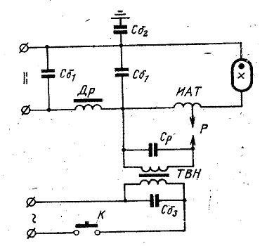 Рассмотрим принципиальную схему включения лампы на постоянном токе (рис. 1). В качестве основного источника питания обычно используется выпрямитель. Искровой генератор поджигающих импульсов питается от источника переменного тока. После замыкания контактов К вручную или автоматически подаваемое напряжение с помощью автотрансформатора высокого напряжения ТВН повышается до 5 кВ, и заряжается рабочий конденсатор Ср до напряжения, необходимого для пробоя воздушного разрядника Р. Конденсатор Ср разряжается через воздушный разрядник Р на первичную обмотку автотрансформатора ИАТ, и в ней возникает импульс высокого напряжения, который через блокировочный конденсатор Сб прикладывается к лампе. Так как после пробоя разрядника Р падение напряжения на нем очень невелико (менее 0,6 кВ), то почти все напряжение конденсатора Ср оказывается приложенным к первичной обмотке ИАТ, что позволяет получить на вторичной обмотке ИАТ получить напряжение примерно 30-35 кВ.