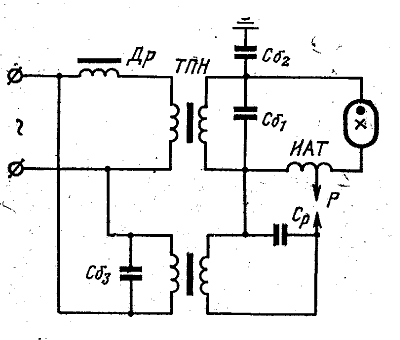 Вторичная обмотка трансформатора ТВН после пробоя разрядника Р оказывается замкнутой накоротко на первичную обмотку ИАТ, обычно состоящую из нескольких витков. Это вызывает необходимость применять меры к ограничению тока во вторичной обмотке ТВН. Такое ограничение тока может быть достигнуто путем установки специальных токоограничивающих сопротивлений во вторичной обмотке ТВН, либо выполнением этого автотрансформатора с большим рассеянием, в котором индуктивное сопротивление рассеяния выполняет роль токоограничивающего сопротивления. Последний вариант предпочтительнее первого, поскольку он экономически более выгоден.