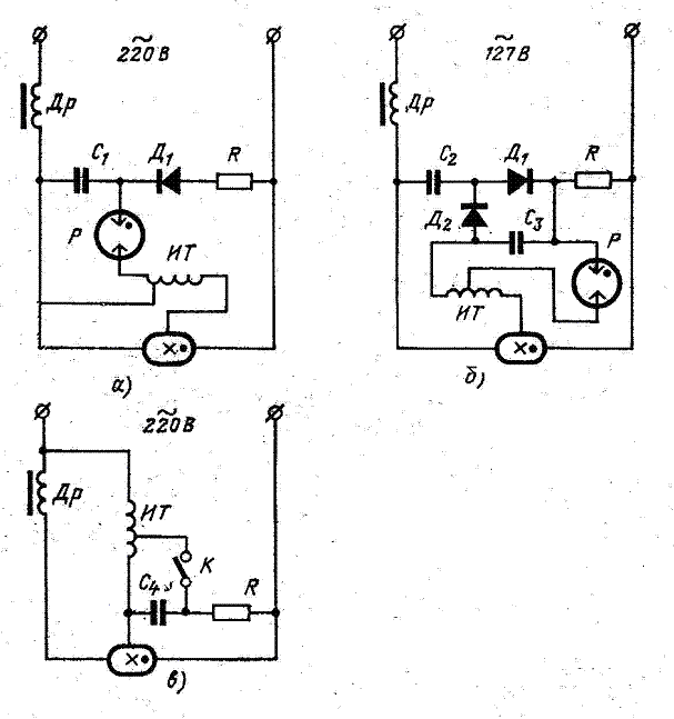 а рис. 4,а показана схема включения лампы ДРШ в сеть переменного тока напряжением 220 В, а на рис. 4,б – в сеть с напряжением 127 В. В первом случае после подключения схемы к сети через токоограничивающий резистор R и диод Д1 конденсатор С1 заряжается , и как только напряжение на нем станет выше напряжения пробоя разрядника Р, последний срабатывает и конденсатор разряжается на импульсный трансформатор ИТ. При этом во вторичной обмотке трансформатора ИТ создается импульс высокого напряжения, который подается на поджигающий электрод лампы. Поджигающие импульсы будут подаваться до тех пор, пока в лампе не возникнет дуговой разряд. После зажигания лампы падение напряжения на балластном дросселе автоматически отключит зажигающее устройство. Во втором случае принцип работы поджигающего устройства аналогичен рассмотренному. Отличие заключается в том, что здесь применена схема удвоения напряжения, для получения необходимого напряжения срабатывания разрядника Р в связи с пониженным напряжением питающей сети. На рис. 4,в приведена упрощенная схема зажигания лампы. Вместо разрядника используется выключатель К. В цепи заряда конденсатора отсутствует диод. При включении К конденсатор С4 разряжается на импульсный трансформатор ИТ, и на поджигающий электрод подается импульс высокого напряжения. Импульсный трансформатор выполняется воздушным. В случае необходимости повышения величины импульса напряжения, импульсный трансформатор может быть изготовлен с сердечником из ферромагнитного материала. Величина импульса в указанных схемах достигает 5-10 кВ.