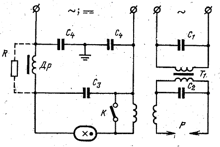 На рис. 5 приведен пример схемы включения двухэлектродной лампы ДРШ. Для создания необходимого высоковольтного импульса высокой частоты, состоящий из трансформатора Т1 и колебательного контура с воздушным разрядником Р. На первичную обмотку трансформатора Т1 подается сетевое напряжение. Конденсатор С2, включенный во вторичную обмотку трансформатора, заряжается, и когда на нем напряжение достигает величины напряжения пробоя воздушного разрядника Р, он почти мгновенно разряжается на первичную обмотку импульсного трансформатора ИТ. Во вторичной обмотке трансформатора ИТ индуцируется высоковольтный высокочастотный импульс, который приводится к рабочему электроду лампы. Таким электродом (в случае работы лампы от сети переменного тока) должен быть электрод, подключенный к фазному или линейному проводу сети. Конденсатор С1 блокирует питающую сеть питающую сеть от попадания в нее высокой частоты. Емкость конденсатора С1 составляет 0,1 мкФ. После зажигания лампы вторичная обмотка импульсного трансформатора шунтируется выключателем К и поджигающее устройство отключается.