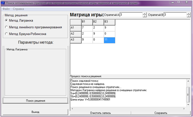 Вывести формулы метода Лагранжа для игры G(3x3). Найти решение парной антагонистической игры G(3х3) используя выведенные формулы для метода Лагранжа. Проверить полученный результат при помощи программного средства.
