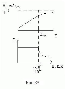 Влияние сильного поля на изменение подвижности носителей заряда зависит от механизма рассеяния. В случае рассеяния на тепловых колебаниях узлов решётки le не зависит от скорости носителей заряда. Поэтому m ~ 1/U0(E), т. е. подвижность будет падать с увеличением напряжённости поля. При рассеянии на ионизированных примесях le ~ U04; отсюда следует, что m ~ U03(E) (рис.89).