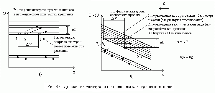 Двигаясь в электрическом поле, электрон меняет и свою координату, и энергию, переходя с одного уровня на другой (рис.87 а). При этом кинетическая энергия его увеличивается на величину eU (где U - пройденная электроном разность потенциалов), а потенциальная энергия увеличивается на ту же величину, так как полная энергия не меняется. Накопленную энергию электрон может потерять при рассеянии, вернувшись на более низкий уровень (электрон 1).
