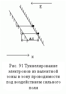 ильному электрическому полю в проводнике соответствует большой наклон энергетических зон (рис.91). В этих условиях электроны могут переходить сквозь узкий потенциальный барьер (толщиной Dх) без изменения своей энергии - туннелировать благодаря своим квантово-механическим свойствам. Т. к. процесс туннелирования происходит вследствие перехода электронов из валентной зоны в зону проводимости, то этот процесс можно считать аналогичным автоэлектронной эмиссии или холодной эмиссии электронов из металла.