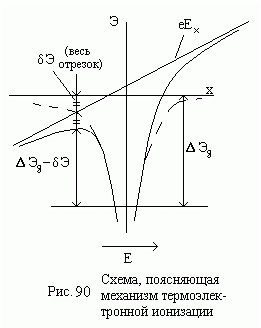 Внешнее электрическое поле изменяет вид потенциальных барьеров между атомами кристаллической решётки. Если внешнее поле отсутствует, то в кристалле между атомами действует периодическое поле, вид которого для одной ячейки показан пунктирной гиперболической кривой (рис.90). Под действием сильного поля несколько уменьшается высота потенциального барьера для электронов в направлении, противоположном направлению поля. Если рассматриваемый барьер относится к примесному атому, например, донору, то уменьшение энергии ионизации на величину dЭ приведёт к увеличению концентрации электронов в зоне проводимости