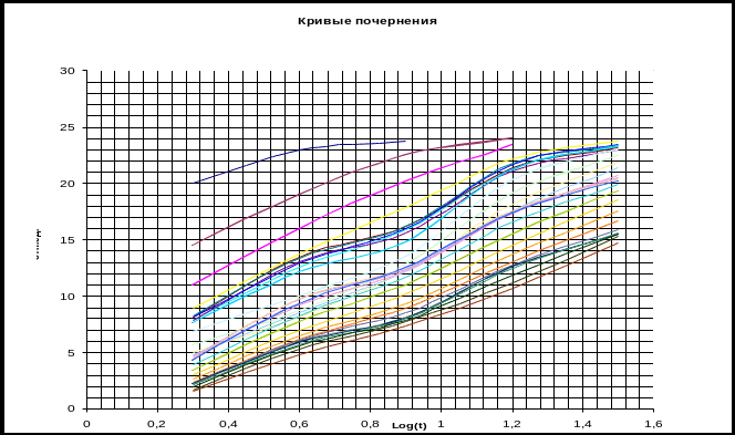 Для использования этой зависимости перестроим зависимость D = f(S) в другом масштабе: кривые почернения от времени в логарифмическом масштабе при разных значениях волнового вектора S. Теперь из полученных кривых почернения мы выбираем характеристическую кривую и продляем ее, выбранная кривая изображена более толстой, черным цветом.
